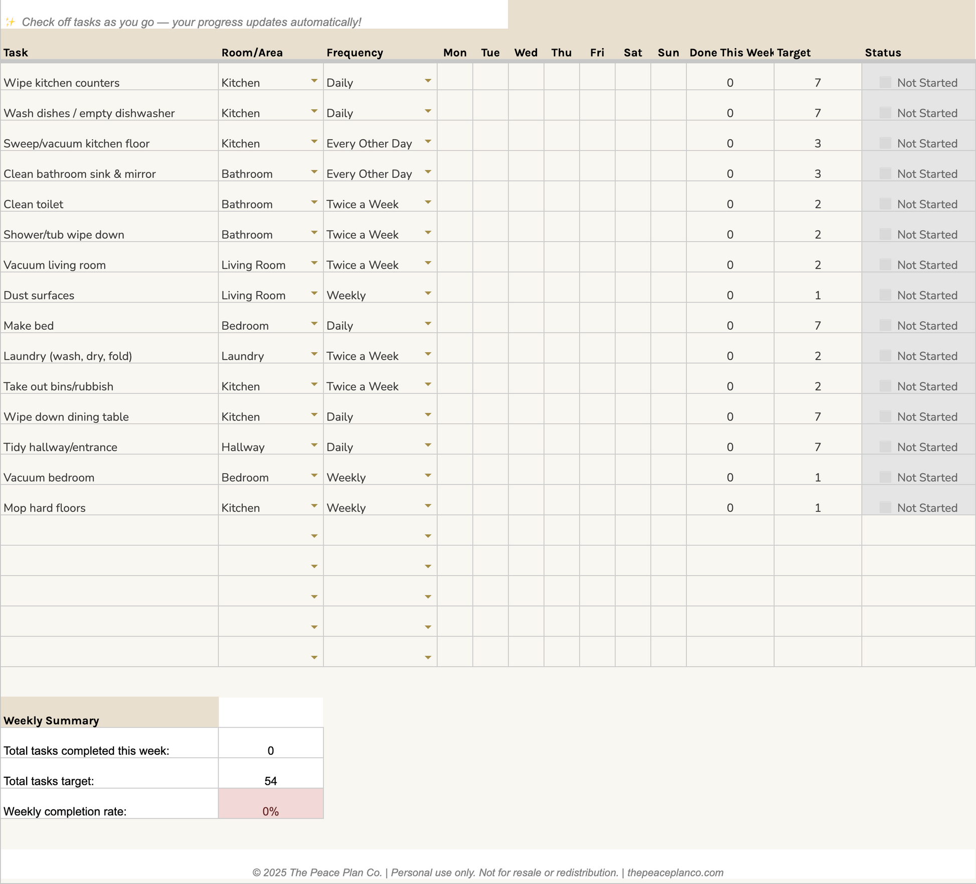 Tab 2: Weekly Cleaning Schedule 15 pre-filled daily cleaning tasks with checkboxes for every day of the week. Your weekly completion rate calculates automatically with colour coding — green for on track, amber for in progress, and soft pink if you need to catch up. Add your own custom tasks too!