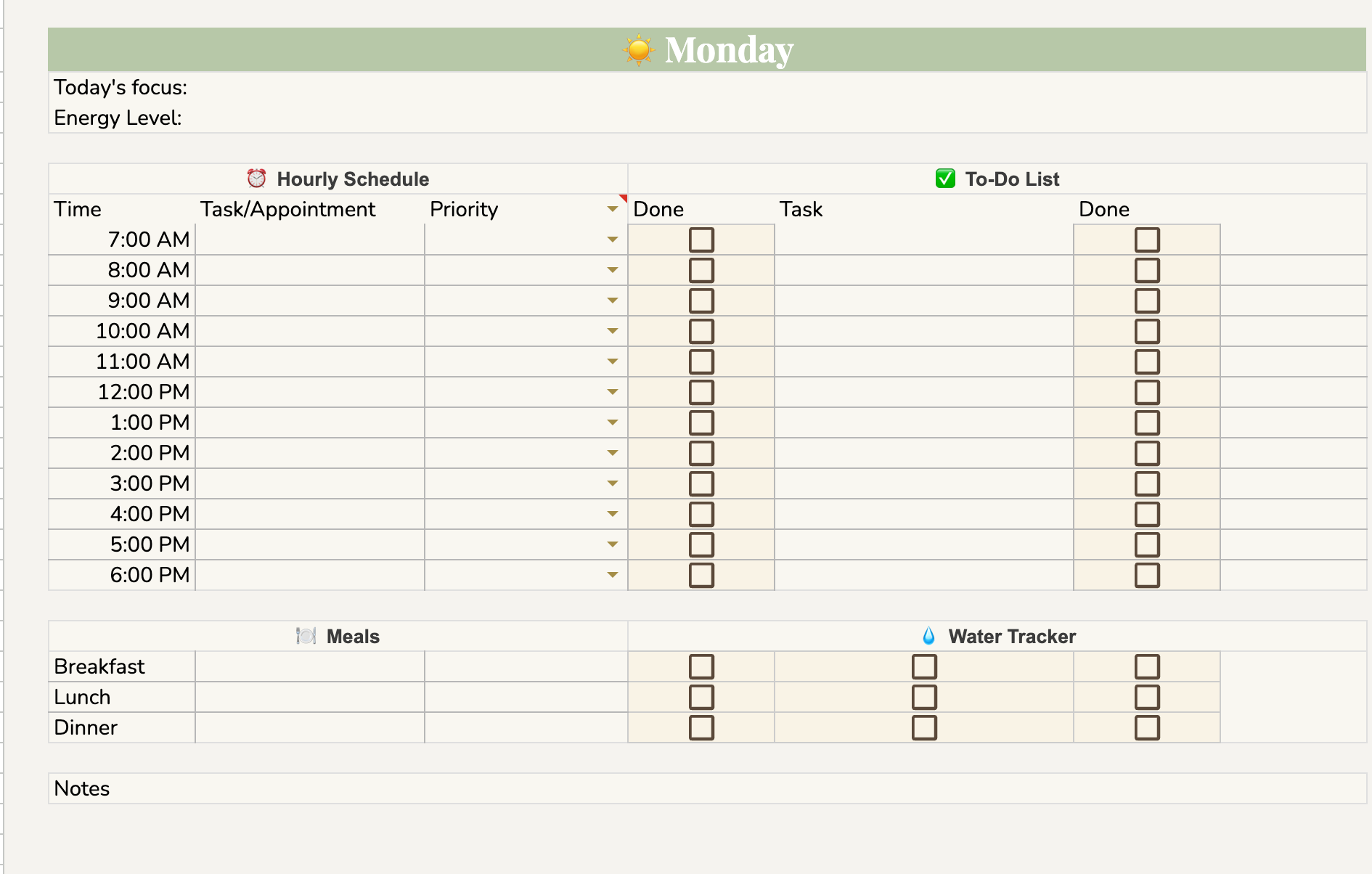 Daily Pages Plan your day hour by hour. Track your energy levels, daily priorities, meals, and water intake.